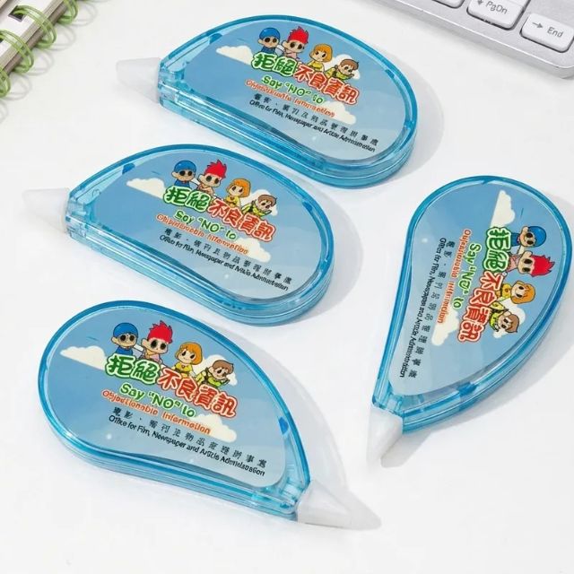 這款 客製化宣傳塗改帶 (改錯帶) 是推廣教育訊息與品牌理念的高效文具禮品。有別於傳統原子筆,其寬闊的平滑機身提供 雙面特大廣告面積,能完整呈現政府部門吉祥物、企業 Logo 或活動 Slogan。內部採用高品質齒輪與高遮蓋力帶芯,滑順不斷帶。